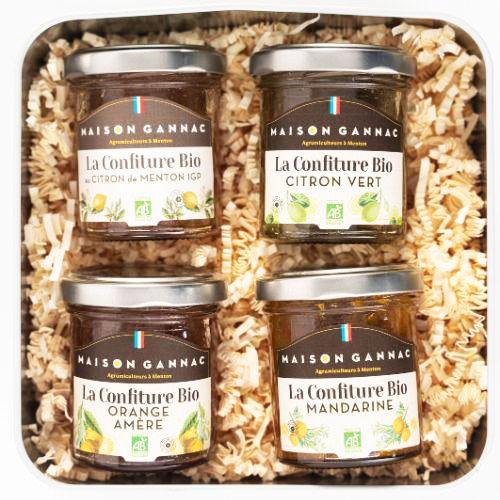 Ce coffret est composé d'une confiture BIO au Citron de Menton (100g), d'une confiture BIO au citron vert (100g), d'une confiture BIO d'orange amère (100g) et d'une confiture BIO de mandarine (100g). L'ensemble est présenté dans une boîte métal illustrée Menton