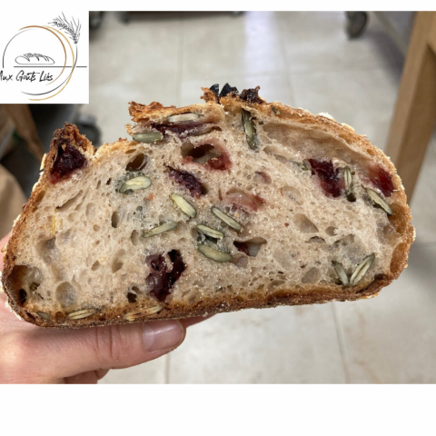 /!\ Rupture d’approvisionnement en noisettes et abricots secs bio : temporairement le pain sera aux amandes torréfiées, cranberries et jus de pomme.